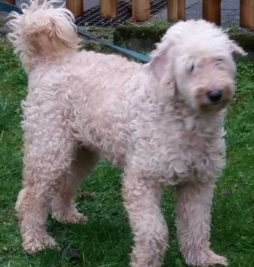 Fotos:Beschreibung:Sie sagen, ich sähe merkwürdig aus ? Ich bitte Sie, es kann sich doch wohl jeder erinnern, wie er sich selbst nach einem misslungenen Frisörbesuch gefühlt hat ! Mit Haaren bin ich nämlich eine ausgesprochen hübsche Hundedame von 3 - 4 Jahren und einer Schulterhöhe von 45 cm. Zunächst hatte ich Eingewöhnungsprobleme, da ich eine extreme Ohrenentzündung und wahnsinnige Schmerzen hatte. Nach 2 Tierarztbesuchen geht es mir aber schon viel besser und ich fange an, mein neues Leben zu geniessen. Ich bin nicht nur hübsch, lieb und unternehmungslustig, ich bin auch verträglich. Meine Pflegemutter hat als Gnadenbrottiere Schafe, Hühner und Enten, mit allen habe ich keine Probleme. Sobald ich mein Fotoshooting hinter mir habe, werden auch Sie sich davon überzeugen können, dass ich auch optisch ein Volltreffer bin. 27.10.16: Na, erkennen Sie mich wieder ? Jetzt dürfen Sie sich an dem grossen Rätselraten beteiligen: Pudelmischling, Wasserhundmischling oder Pumimix ? Ich kann leider nichts dazu sagen. Fest steht nur eines: Ich bin Menschen gegenüber eher unterwürfig, wenn ich Vertrauen geschöpft habe, aber sehr anhänglich, verschmust und verspielt. Hunden gegenüber bin ich selbstsicher und verträglich, Schafe, Enten und Hühner ignoriere ich , zeige keinen Jagdtrieb. Wenn Sie mich kennenlernen, werden Sie feststellen, dass meine Lockenpracht nicht herunterrieselt,d.h., ich nicht haare; dann werden Sie sicher auch den kleinen Schönheitsfehler übersehen, dass meine Ohren nach Abklingen der schlimmen Entzündung noch etwas haarlos sind. 4.12.16: Ich habe mein Zuhause gefunden. Frauchen erklärt, ich sei ihr Schatten, d.h., ich begleite sie aus Schritt und Tritt. Ist doch klar: Mein erstes richtiges Zuhause will ich eben nie wieder verlieren. Nachdem meine Haarpracht sich wieder erholt hatte, waren sowohl die Tierärztin als auch meine Pflegemuuter überzeugt, dass in mir ein Flat coated Terrier steckt. Die Fotos schicke ich noch, aber die Antwort auf diese Frage ist zumindest mir völlig schnuppe... | ||